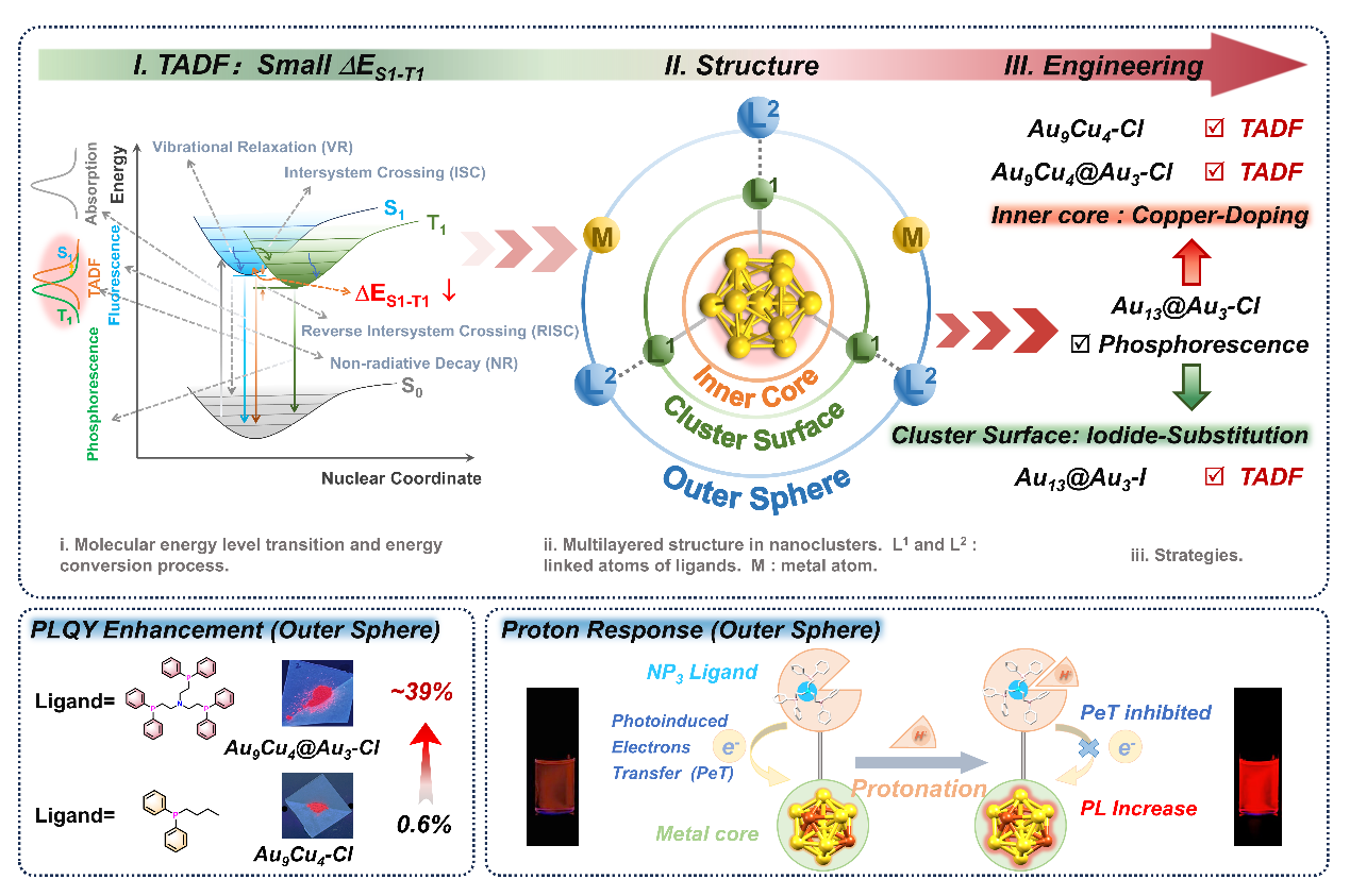 此前,发光币金属纳米团簇因其丰富的结构多样性及显著的结构依赖发光特性,在发光器件、传感和光催化等领域展现出重要应用前景。然而,与传统有机荧光分子或小分子金属配合物相比,其发光机制更为复杂,通常受到尺寸、组成、电子结构、金属–金属相互作用以及金属–配体键合等多因素的影响,如何在同一结构平台上系统调控发光性能,特别是实现热激活延迟荧光(Thermally Activated Delayed Fluorescence, TADF)的调控,是领域发展的难题。