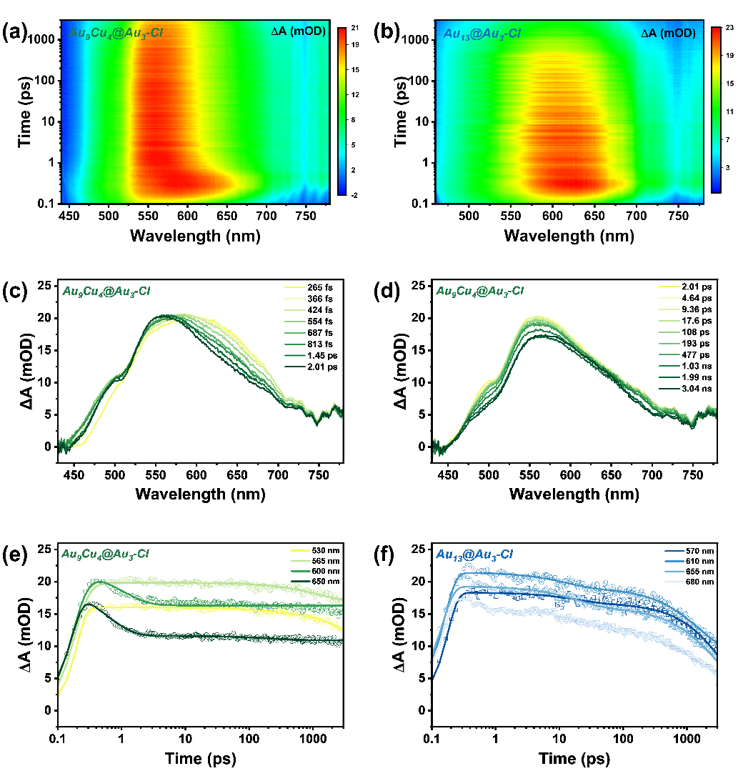 图4. Au9Cu4@Au3-Cl(a)和Au13@Au3-Cl(b)的3D飞秒瞬态吸收谱图。(c)、(d) Au9Cu4@Au3-Cl在不同时间范围内的瞬态吸收曲线。Au9Cu4@Au3-Cl(e)和Au13@Au3-Cl(f)在选定波长下的动力学拟合曲线。