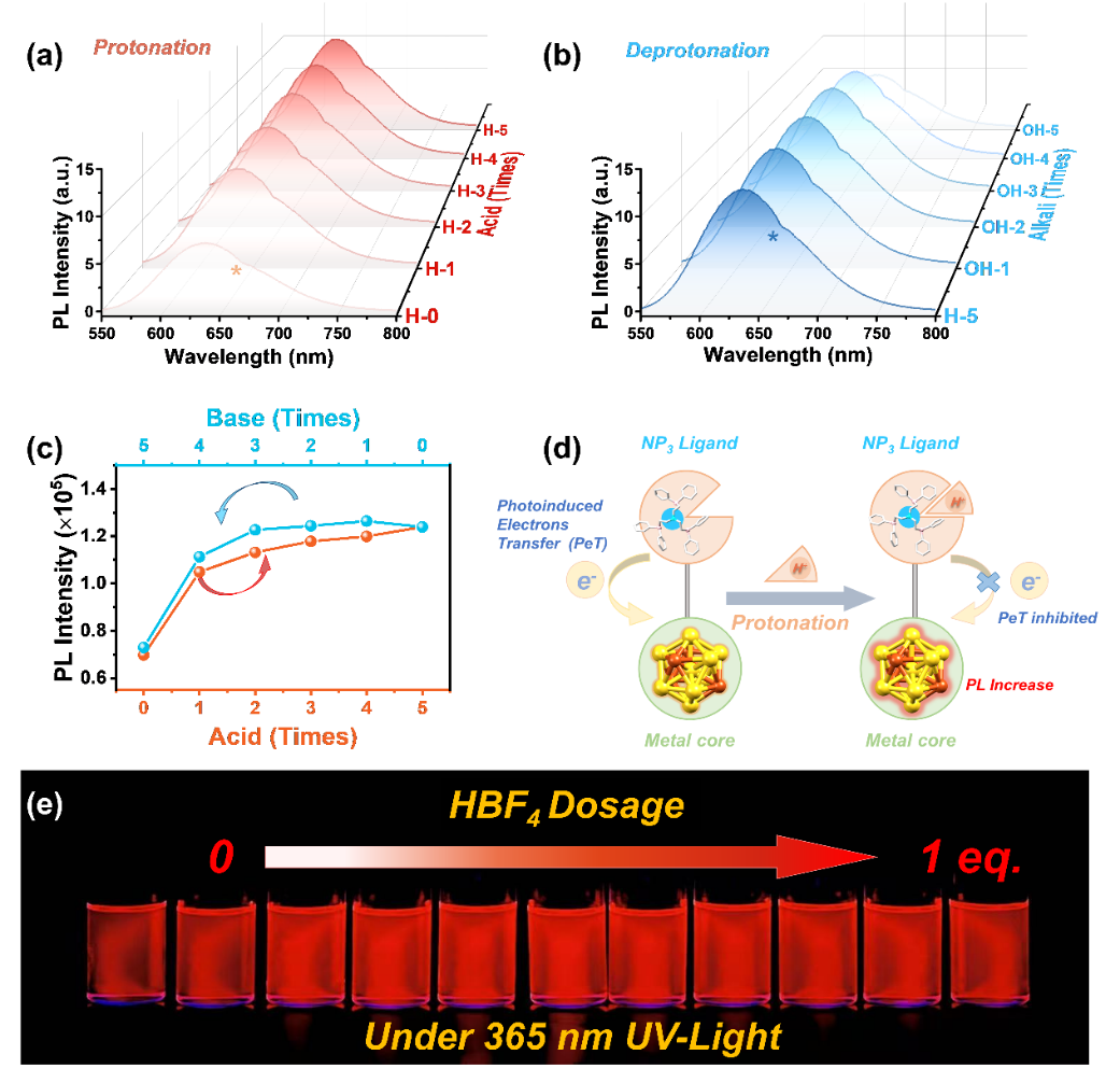 在溶液条件下,随着酸浓度的逐步增加,团簇的发射强度持续增强;当缓慢滴加等当量碱后,发射强度又逐渐减弱并恢复至初始水平,表现出瞬时且可逆的酸诱导发光增强(protonation-induced enhancement)与碱诱导发光猝灭(deprotonation-induced quenching)行为。该现象主要源于酸性条件下配体质子化有效抑制了光诱导电子转移(PET)等非辐射衰减路径,从而增强发光;而碱的加入中和酸性环境,使体系恢复至原始电子结构状态,发光强度随之回归初始水平。