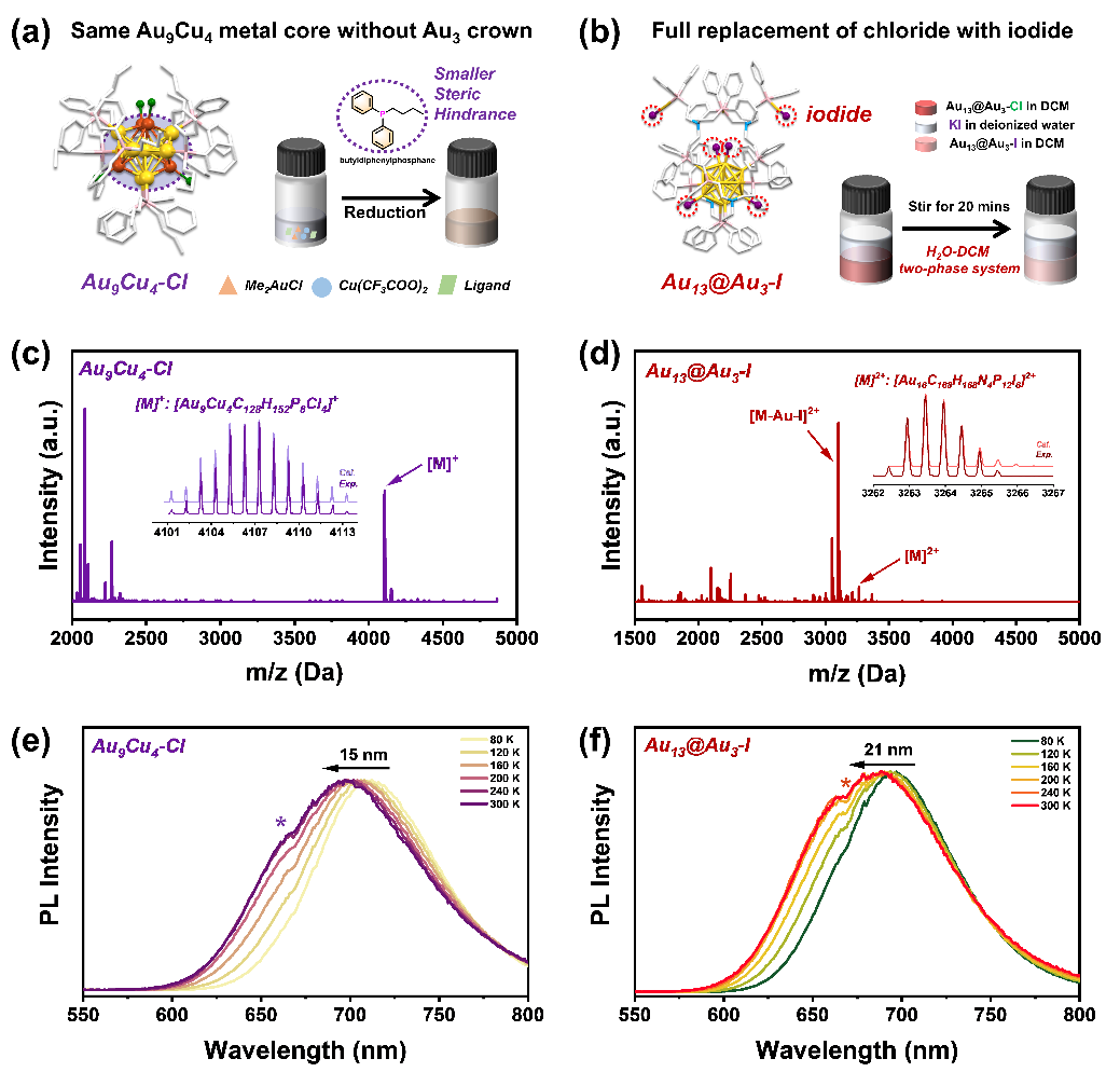 图5. Au9Cu4-Cl(a)和Au13@Au3-I(b)的调控策略。Au9Cu4-Cl(c)和Au13@Au3-I(d)的高分辨质谱分析。Au9Cu4-Cl(e)和Au13@Au3-I(f)的从80 K至300 K发射谱图。