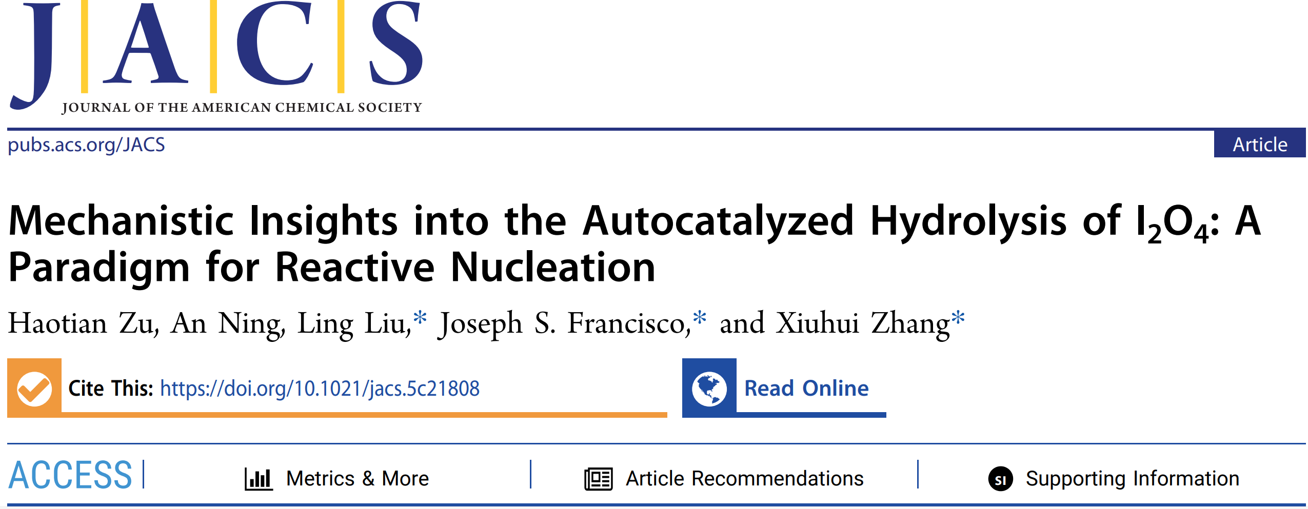 近日,国产无码 张秀辉教授、刘玲副教授及美国宾夕法尼亚大学 Joseph S. Francisco教授团队合作,在海洋气溶胶成核机制研究方面取得重要进展。相关研究成果以“Mechanistic Insights into the Autocatalysed Hydrolysis of I2O4: A Paradigm for Reactive Nucleation”为题,在国际顶级化学期刊《美国化学会志》(Journal of the American Chemical Society,JACS,DOI: 10.1021/jacs.5c21808)上发表。该工作以国产无码 为第一通讯单位,张秀辉教授、刘玲副教授和Joseph S. Francisco教授为论文共同通讯作者,国产无码 博士研究生祖昊天为第一作者。